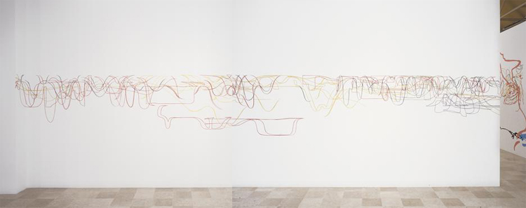 Elle apparaîtrait plutôt comme, tout à la fois, une pictorialisation et un dérèglement des courbes polysomnographiques évoquées précédemment ou, par sa complexité réticulaire, comme la version non figurative des superpositions de plans mises en oeuvre par la Pièce rouge ou les dépositions de l'Appartement de l'artiste (et plus particulièrement la pièce de 1992, désormais détruite, qui déposait au sol, en les rabattant les uns sur les autres, en une savante structure de bois mouluré, les motifs ornementaux, courbes et rectilignes, des quatre murs d'un salon dans le style du XVIIIème siècle). La frise, anamorphose ultralinéaire d'un dessin plutôt circulaire dans son (in)organisation originelle, ajoute la quatrième dimension, le temps, à son ordre plastique. Mais le déroulement du temps qu'engage sa vision ne s'appuie nullement sur quelque narration. Le temps s'écoule dans le parcours labyrinthique des traits ; aucune histoire ne progresse.