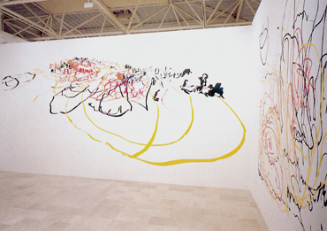Face à ces amples dessins muraux, un décalage est flagrant : le type de gestualité qu'implique le tracé des dessins exposés a l'empan, et non l'architecture, comme terrain d'exercice. Ce ne peut être que sur quelques centimètres carrés que pareil gribouillage trouve raisonnablement à s'effectuer, non sur l'étendue d'une vaste cimaise. Autrement dit, la dimension du produit visible, le wall drawing, est étrangère à la réalité gestuelle de son procès originaire. Mais l'incompatibilité entre les effusifs petits coups de feutre qu'une main d'enfant peut déposer sur le papier et l'imposant autant qu'impeccable dessin mural n'est pas que dimensionnelle, elle est également statutaire. Si l'agrandissement contredit le geste natif d'engendrement, il accorde également une manière de promotion esthétique à ce qui n'était au départ qu'un simple griffonnage.