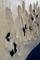 Les deux femmes dans la Madone de Bentalha forment évidemment l’ensemble le plus baroque de tout ce travail, leurs corps absents étant habillés de châles et de manteaux qui donnent prétexte à un somptueux relief, le seul des trois sculptures. Comme on ne peut pas ne pas penser, devant elles, à la Sainte Thérèse du Bernin, il s’ensuit une sorte de contamination érotique par cette dernière qui, par exemple, du geste de soutien apporté par la femme en noir à sa compagne fait une caresse sur le sein, pas plus appuyée qu’une marque de la main dans le sable. Toutefois, lorsque le spectateur se détache de la fascination exercée par les volutes des manteaux, et qu’il cherche à s’approcher des visages, alors ce sentiment d’abandon que communique l’œuvre, de l’abandon voluptueux dans la douleur, fût-elle la plus terrible, ou justement parce qu’elle est la plus terrible, bascule en une sensation de vertige. Selon un certain point de vue, le relief inversé du cou et du menton de la femme éplorée apparaît comme un entonnoir. Autrement dit, la bouche s’ouvre monstrueusement comme une bouche d’évacuation où il semble que le cri proféré retourne et s’étouffe. Visionnant des images archivées par Convert, je me rends compte que celui-ci collectionne les photographies de bouches ouvertes : bouches d’enfants et de femmes ouvertes par la peur, par les pleurs. Peut-être l’idée de travailler la sculpture par emboutissage lui est-elle venue de l’examen de ces images où le cri expulsé du plus profond de la poitrine, mais qu’on ne peut plus entendre, s’inverse en une plaie qui ouvre la chair.