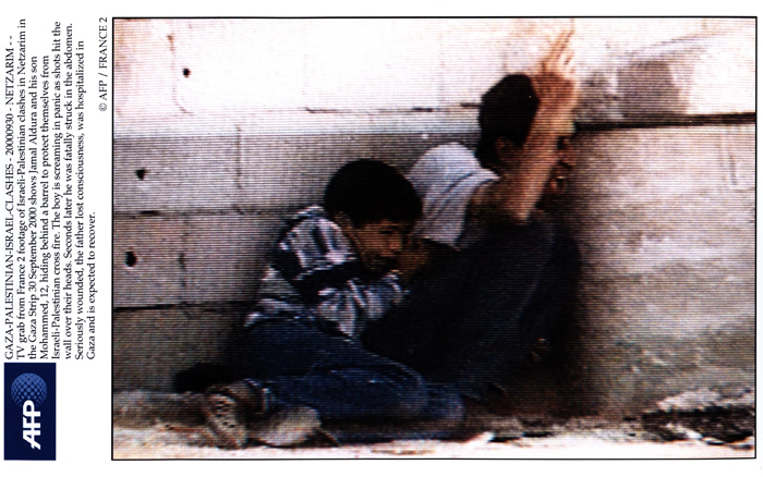 "15 heures : tout vient de basculer près de l'implantation de Netzarim dans la bande de Gaza. Des Palestiniens ont tiré à balle réelle, des Israéliens ripostent. Ambulanciers, journalistes et simples passants sont pris entre deux feux. Ici Djamal et son fils Mohamed sont la cible de tirs venus de la position israélienne. Mohamed a 12 ans, son père tente de le protéger. Il fait des signes mais une nouvelle rafale : Mohamed est mort et son père gravement blessé".